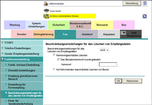 Wählen Sie im Administratormodus [Fax] - [Funktionseinstellung] - [Beschränkungseinstellungen für das Löschen von Empfangsdaten] und richten Sie dann die folgenden Einstellungen ein.