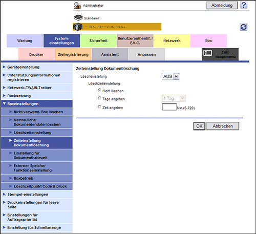 Für alle Öffentliche Boxen, Persönlichen Boxen und Gruppenboxen gibt der Administrator an, nach welcher Zeitspanne Dateien nach ihrer Speicherung oder nach dem letzten Druck bzw. Versand automatisch gelöscht werden.