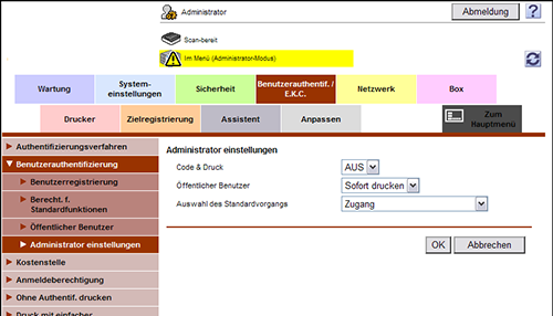 Wählen Sie im Administratormodus [Benutzerauthentif. / E.K.C.] - [Benutzerauthentifizierung] - [Administratoreinstellungen].