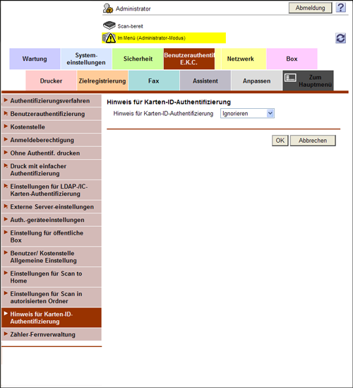 Wählen Sie im Administratormodus [Benutzerauthentif. / E.K.C.] - [Hinweis für Karten-ID-Authentifizierung] und setzen Sie [Hinweis für Karten-ID-Authentifizierung] auf [Benachrichtigen] (Standard: [Ignorieren]).
