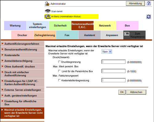 Wählen Sie im Administratormodus [Benutzerauthentif. / E.K.C.] - [Maximal zulässiger Wert bei ausgefallenem erweit. Server] und richten Sie dann die folgenden Einstellungen ein.