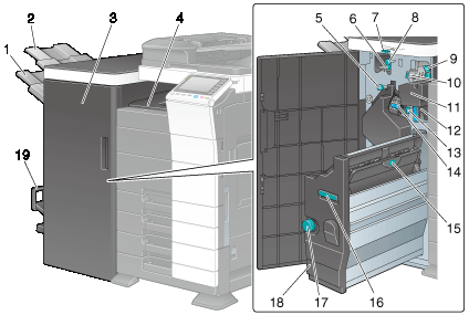 18 | Broschürenfinisher | Ziehen Sie diese Einheit zum Beheben eines Papierstaus oder Heftklammerstaus oder zum Austauschen eines Heftklammermagazins heraus. |