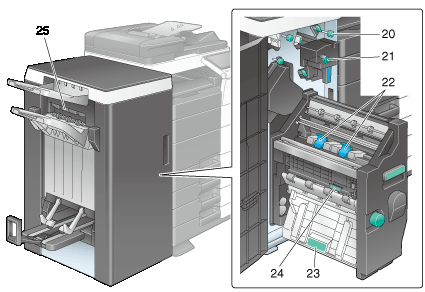20 | Rad zur Papierstaubehebung [FS2] | Drehen Sie an diesem Rad, um Papier zu entfernen, das einen Papierstau im Finisher verursacht hat. |