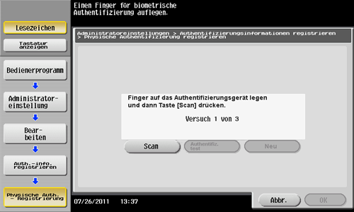 Scannen Sie ein Fingervenenmuster dreimal. Legen Sie nach jedem Scanvorgang den Finger erneut auf die Authentifizierungseinheit und tippen Sie auf [Scan].
