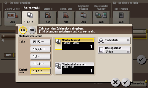 Geben Sie über die Tastatur die Startkapitelnummer ein, wenn ein Original in Kapitel unterteilt ist und Sie erst ab dem zweiten Kapitel oder später Seitenzahlen mit Kapitelnummer drucken möchten. Tippen Sie zur Anzeige der Tastatur auf den Eingabebereich für Zahlen. Sie können Seitenzahlen mit Kapitelnummern nur angeben, wenn Sie unter [Seitenzahlenformat] die Option [Kapitelseite] ausgewählt haben. Geben Sie zum Beispiel für den Druck von Kapitelnummern ab dem dritten Kapitel "-1" ein. Das erste Kapitel der Datei wird als "-1", das zweite Kapitel als "0" und das dritte Kapitel als "1" gezählt. Unter [Startkapitelnummer] wird festgelegt, dass die Kapitelnummer für die Kapitel gedruckt wird, die als 1 und höher gezählt werden. Wenn "2" eingegeben wird, wird die Nummer ab der ersten Seite des ersten Kapitels der Datei in der Form "2-1, 2-2" gedruckt. "-" (Minuszeichen) wechselt bei jedem Tippen auf [*] zu +.