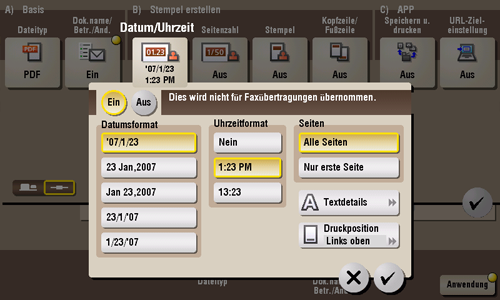 Sie können eine Druckposition und das Format auswählen und das Datum und die Uhrzeit einfügen. Datum und Uhrzeit können entweder auf allen Seiten oder nur auf der ersten Seite gedruckt werden.