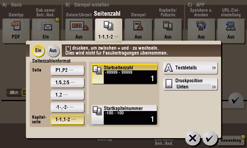 Geben Sie über die Tastatur die Startkapitelnummer ein, wenn ein Original in Kapitel unterteilt ist und Sie erst ab dem zweiten Kapitel oder später Seitenzahlen mit Kapitelnummer drucken möchten. Tippen Sie zur Anzeige der Tastatur auf den Eingabebereich für Zahlen. Sie können Seitenzahlen mit Kapitelnummern nur angeben, wenn Sie unter [Seitenzahlenformat] die Option [Kapitelseite] ausgewählt haben. Geben Sie zum Beispiel für den Druck von Kapitelnummern ab dem dritten Kapitel "-1" ein. Das erste Kapitel der Datei wird als "-1", das zweite Kapitel als "0" und das dritte Kapitel als "1" gezählt. Unter [Startkapitelnummer] wird festgelegt, dass die Kapitelnummer für die Kapitel gedruckt wird, die als 1 und höher gezählt werden. Wenn "2" eingegeben wird, wird die Nummer ab der ersten Seite des ersten Kapitels der Datei in der Form "2-1, 2-2" gedruckt. "-" (Minuszeichen) wechselt bei jedem Tippen auf [*] zu +.
