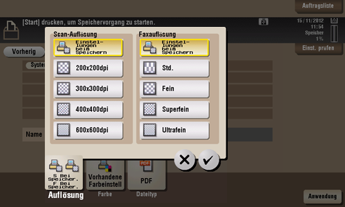 [Scan-Auflösung] | Wählen Sie eine Auflösung für die Dokumentdatei, wenn diese auf einem externen Speicher abgelegt wird.
