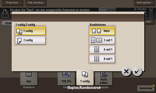 [1-seitig/2-seitig] | Das Original wird entweder auf eine oder auf beide Seiten des Papiers gedruckt. |