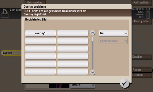 Speichert eine Datei als Overlay-Bild. Nach der Registrierung können Sie während des Kopierens oder Druckens ein Overlay-Bild auf dem Original erstellen.