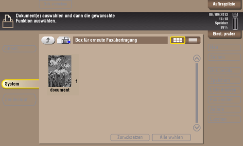 Wenn das Empfängersystem belegt ist und keine Verbindung hergestellt werden kann, werden unzustellbare Faxdokumente in der Box für die erneute Faxübertragung abgelegt. Nachdem Sie die Box geöffnet haben, können Sie ein in der Box gespeichertes Faxdokument auswählen und dieses anzeigen, ausdrucken, senden oder löschen.