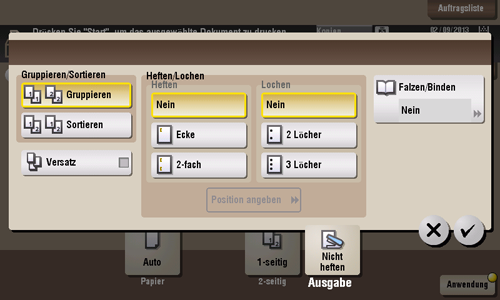 [Sortieren] | Wählen Sie diese Einstellung, um die Kopien dokumentweise auszugeben, z.B. in der Reihenfolge "12345", "12345" und "12345". |