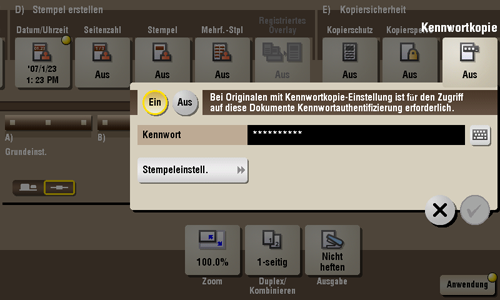 Die Kennwortkopie ist eine Kopiersperrenfunktion, mit der verborgene Sicherheitswasserzeichen (z.B. "Privat") oder ein Datum im Hintergrund gedruckt werden, um die Anfertigung von unautorisierten Kopien zu verhindern. Zudem wird auf allen gedruckten Seiten ein Kennwort für die Kennwortkopie-Funktion eingebettet.