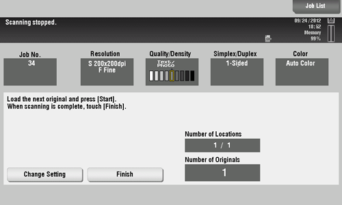6. After all originals are scanned, tap [Finish] and press the Start key.