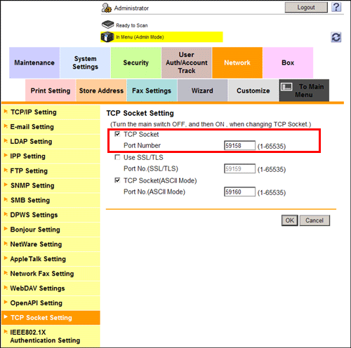 In the administrator mode, select [Network] - [TCP Socket Setting], then configure the following settings.