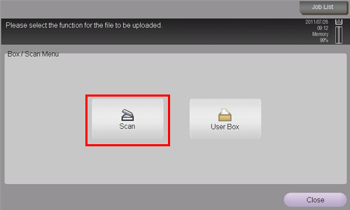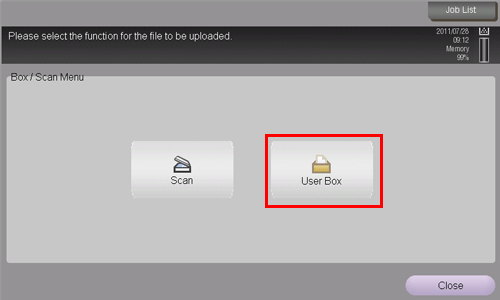 Select a User Box that contains a file to be uploaded, then tap [Open].