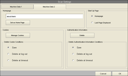 Tap [Menu] - [Settings] - [Settings] on the toolbar to configure the detailed settings of the Web browser. To display [Scan Settings], you need to enter the administrator password of this machine.