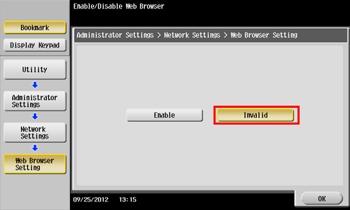 Tap [Utility] - [Administrator Settings] - [Network Settings] - [Web Browser Setting].