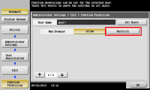 If user authentication is installed on this machine, you can restrict use of the Web browser for each user.