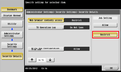 Tap [Utility] - [Administrator Settings] - [Security Settings] - [Security Details].