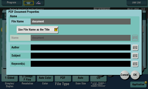 [Author] | Enter the name of the author of a PDF file (using up to 64 characters). If user authentication is installed on this machine, specify the user name as the author. |