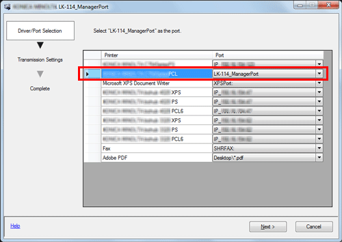 Specify the MFP that matches the MFP on which you select [LK-114_ManagerPort] on the driver/port selection window in step 2.