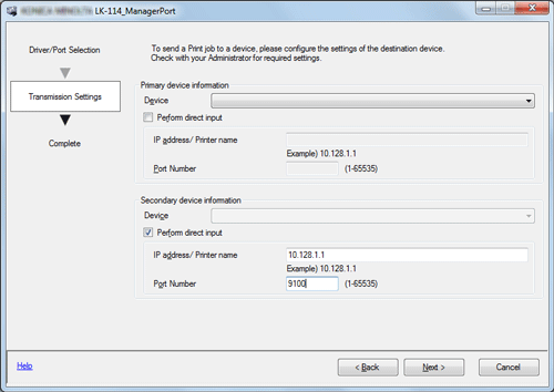To configure LK-114_ManagerPort, specify the IP address and port number of the MFP to which print jobs are to be sent. If there is a device definition file, ask the administrator for the file name. Otherwise, ask the administrator for the IP address and port number of the destination. For details on the device definition file, refer to Here.