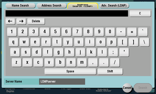 In the LDAP server or Windows Server Active Directory is used, specify a single keyword to search for an E-mail address or fax number.