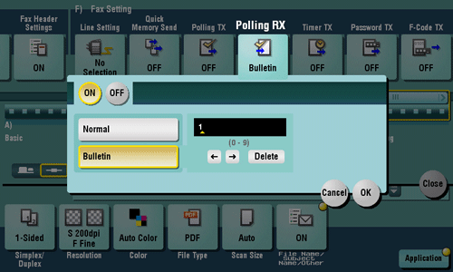 [Bulletin] | Select this option to receive a file stored in a Bulletin User Box. Enter the user box number of the Bulletin Board User Box in the destination machine in which your desired file is stored using the Keypad. To display the Keypad, tap the input area for the numeral. |