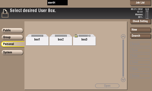 To access a file in this User Box, select the desired User Box, then tap [Open].