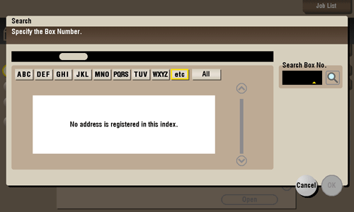 This window is used to search for a User Box. The User Boxes are displayed based on search characters you have specified during box registration.