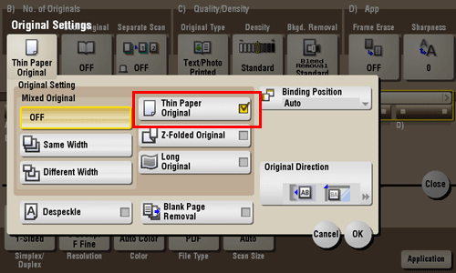 This function reduces the transport speed of the original on the ADF to prevent the original from being caught when scanning an original that is thinner than plain paper.