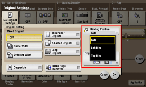 Automatically configures the binding position of the original. When the long side of the original is 11-11/16 inches (297 mm) or less, the binding position is set to the long side of the paper. When the long side of the original exceeds 11-11/16 inches (297 mm), the binding position is set to the short side of the paper.