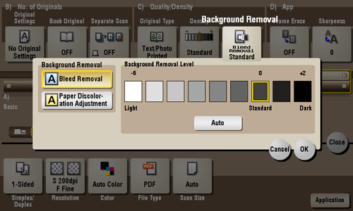 [Background Removal Level] | Tap this button to adjust the density of the background color for an original with the colored background. Selecting [Auto] automatically determines the density of the background color, and scans an original at the optimum background density level. |