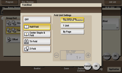 Feeds out a printed sheet by folding it in two. Also select the unit by which the paper is folded from [By Copy Job (Multiple Sheets)], [1 Unit], and [By Page]. When you set [By Page], specify the number of pages to be folded at one time.