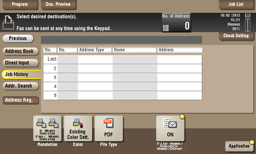 Tap [Job History], and you can select a destination from the scan or fax history. The latest jobs (up to five) are displayed for history purposes. When necessary, multiple destinations can be selected from the history.