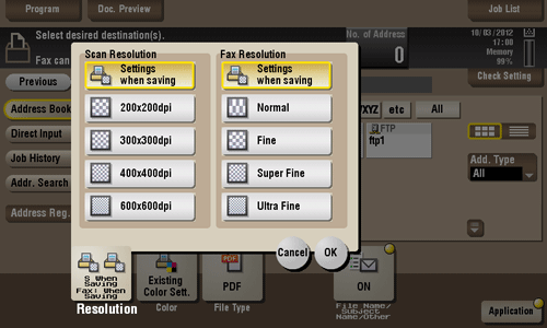 [Scan Resolution] | Select the resolution to be used for scanning and sending of the original. To use E-mail TX, SMB TX, FTP TX, or WebDAV TX, the following resolution is selected for sending.