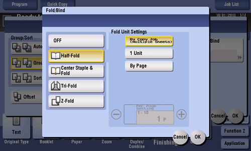 Feeds out a copied sheet by folding it in two. Also select the unit by which the paper is folded from [By Copy Job (Multiple Sheets)], [1 Unit], and [By Page]. When you set [By Page], specify the number of pages to be folded at one time.