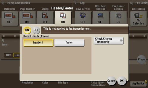 [Check/Change Temporarily] | If necessary, check or temporarily change the details of the program that is selected in [Recall Header/Footer].