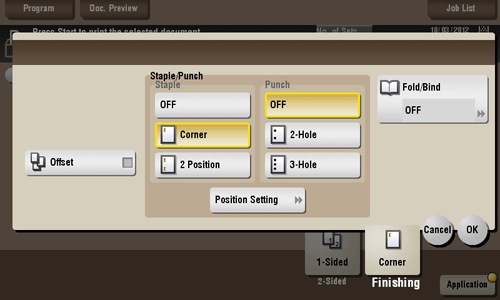 [Punch] | Select binding positions when punching sheets. For details, refer to Here. |
