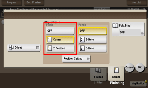 [2 Position] | Each set of printed sheets is stapled at two positions (in the top, left, or right) before it is output. |