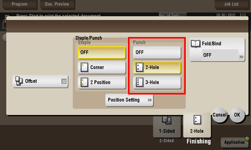 [Position Setting] | Select a position to punch. If the punch position is set to [Auto], the position to punch is determined automatically based on the direction of print file. |