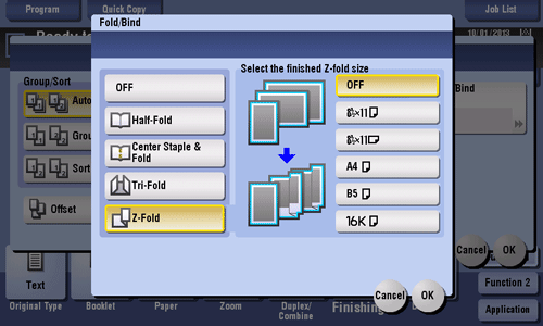 To use the Z-Fold function, the Finisher FS-535 and Z Folding Unit ZU-606 are required (only for bizhub 554e).