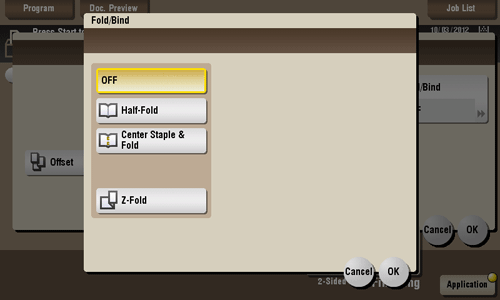[Center Staple & Fold] | Staples and feeds out a printed sheet by folding it in two. For details, refer to Here. |