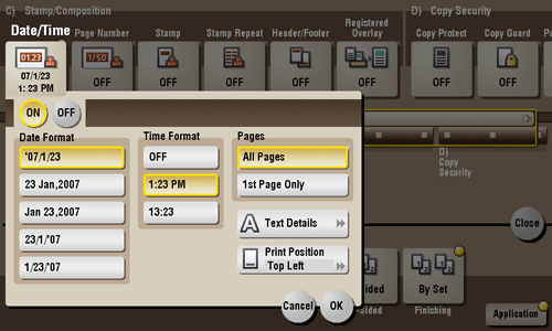 You can select a print position and format, and add the date and time. The date and time can be printed either on all pages or only on the first page.