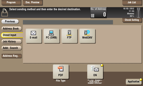 [PC (SMB)] | Enters the destination PC name (host name) or IP address to send files to the shared folder of the network PC. |