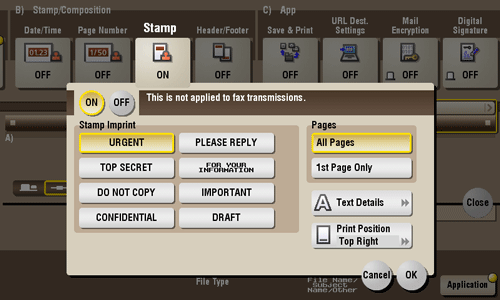 Text such as "PLEASE REPLY" and "DO NOT COPY" are printed on the first page or all pages. You can select the text to be printed from the registered fix stamps and arbitrary registered stamps.