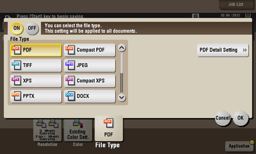 [PDF Detail Setting] | If [PDF] or [Compact PDF] is selected for file format, you can configure the PDF option settings. You can enhance security by attaching a digital signature that identifies the author of the file, by file encryption, etc. For details, refer to Here. |
