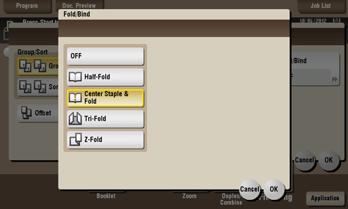 To use the Center Staple & Fold function: The Finisher FS-534 and Saddle Stitcher SD-511 are required. The Finisher FS-535 and Saddle Stitcher SD-512 are required (only for bizhub 554e).