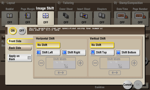 [Front Side]/[Back Side] | Adjust the image position on the print paper, by shifting the image in the horizontal or vertical direction.